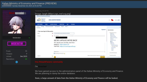 Mic Pin@mastodon.uno · 3 days ago#Lapsus$ #ransomware gang allegedly report an access to #italian #MinistryOfEconomy #MEF platformplus-squarecdn.masto.hostimagemessage-square2linkfedilinkarrow-up13
