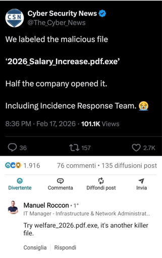 𐌐𐌀Ꝋ𐌋Ꝋ :antifa:@mastodon.uno · 9 days agoA fronte di un aumento degli attacchi del 53% nel solo 2025, il nostro Paese spende in #CyberSecurity appena un ventiquattresimo di quanto perde a causa dei danni informatici, stimati dall’ACN in 56plus-squaremessage-squaremessage-square0linkfedilinkarrow-up12