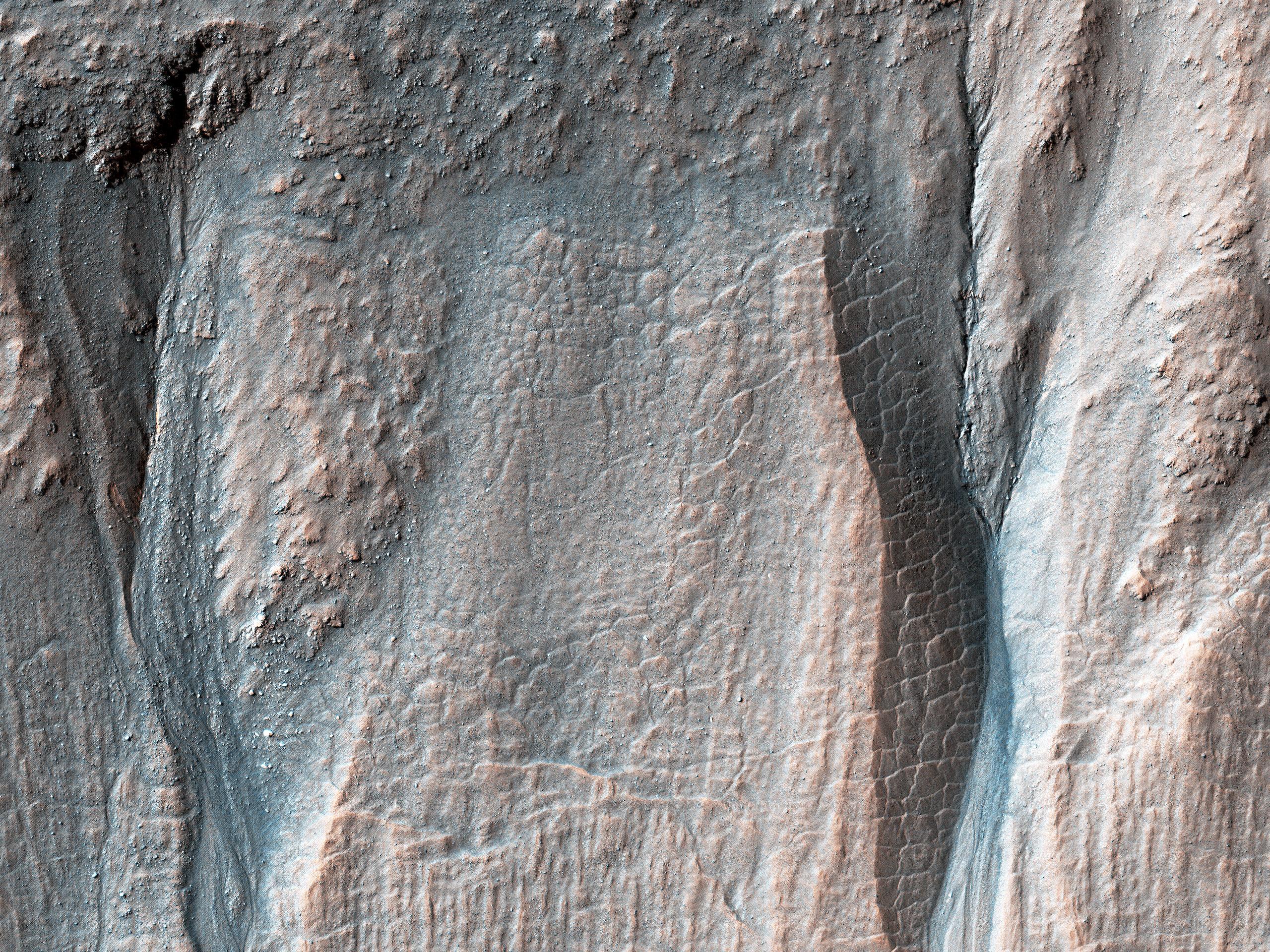 I calanchi lungo il versante rivolto verso il polo di questo cratere del diametro di 10 chilometri, situato negli altopiani meridionali di Marte, hanno origine a diverse altitudini lungo il bordo. I calanchi orientali (a destra) hanno origine sul bordo del cratere o nelle sue vicinanze, mentre quelli più occidentali erodono o scavano strati detritici lungo i versanti a media altitudine.