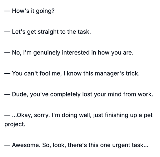 But usually respond with a “I’m fine, thanks. What about you?” as protocol requires 🤠😀🙃🫠