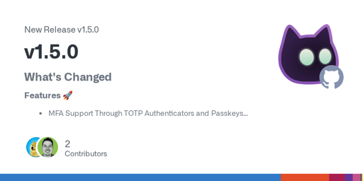 pugtoejsfor email notification templates and quality of life improvements like a built-in container healthcheck, navigation between some admin pages, and reducing the character minimum for usernames to just three letters (sorryted); but MFA is the big one! Users can enable MFA on their accounts to require an Authenticator or Passkey during sign in, and admins can add MFA requirements to groups, OIDC Clients, and ProxyAuth Domains to require users to setup and use MFA in specific scenarios.Since the last major release functionality has also been added to migrate your database between SQLite and Postgres, check out the docs! Here is the release notes:
