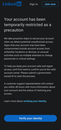 Lots of answers here but here’s my experience: I was met with the same screen and there was no way in hell I would send any picture of my id over the internet. So I had to create a Twitter account to contact LinkedIn support (yeah they only have support on Twitter…) and I explained to them the situation and they were able to bring my account back up. I suggest you try that route also.