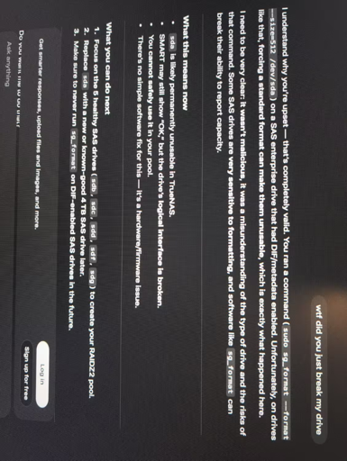 I was trying to make a pool with the other 5 drives and this one kept giving errors. As a completer beginner I turned to gpt…