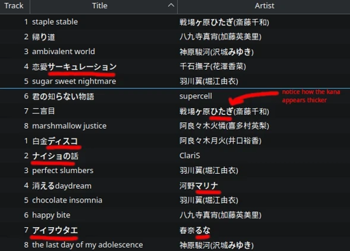 ~/.config/fontconfig/fonts.confto Droid Sans Fallback (I also tried setting it to Noto Sans CJK Light), then confirming changes usingfc-match. Restarted and clearedfc-cache. Dolphin and Strawberry did not respect my changes. Nautilus does though. (Qt issue?)Something tells me it’s a KDE or Qt thing, or maybe it’s a Fedora thing? It works fine with GNOME and GTK apps like Nautilus. This is beyond what I know at this point so I’ll just post this over to the Fedora forums.