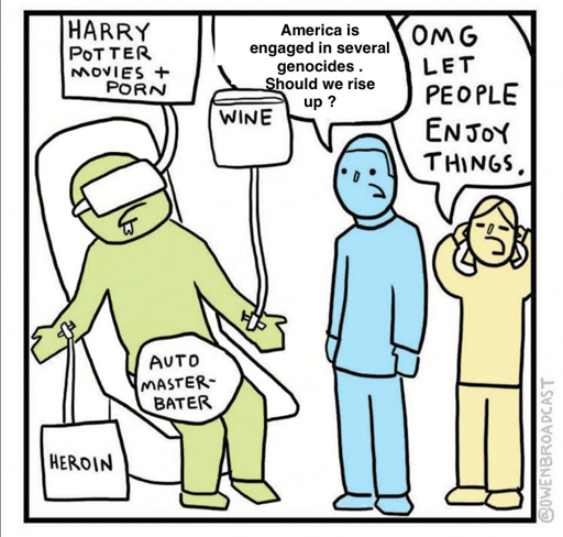 Idk if this is OC or not but goddamn it’s on point and extremely relevant. Sometimes people forget the only reason the West can just get lost in consumerism and hedonism is because of the stolen resources and subjugation of people around the world. 🥲